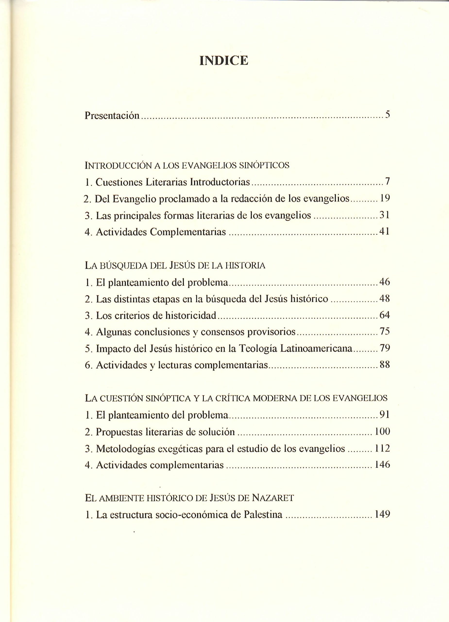 El primer capítulo versa sobre la cuestión literaria de los evangelios. El segundo discute y pone al día sobre la candente problemática del Jesús histórico; el tercero estudia las propuestas de solución sobre la relación de los evangelios entre sí y propone unos modos de proceder en el estudio de los textos sagrados. El último se ocupa de Jesús de Nazaret y el ambiente de su época.